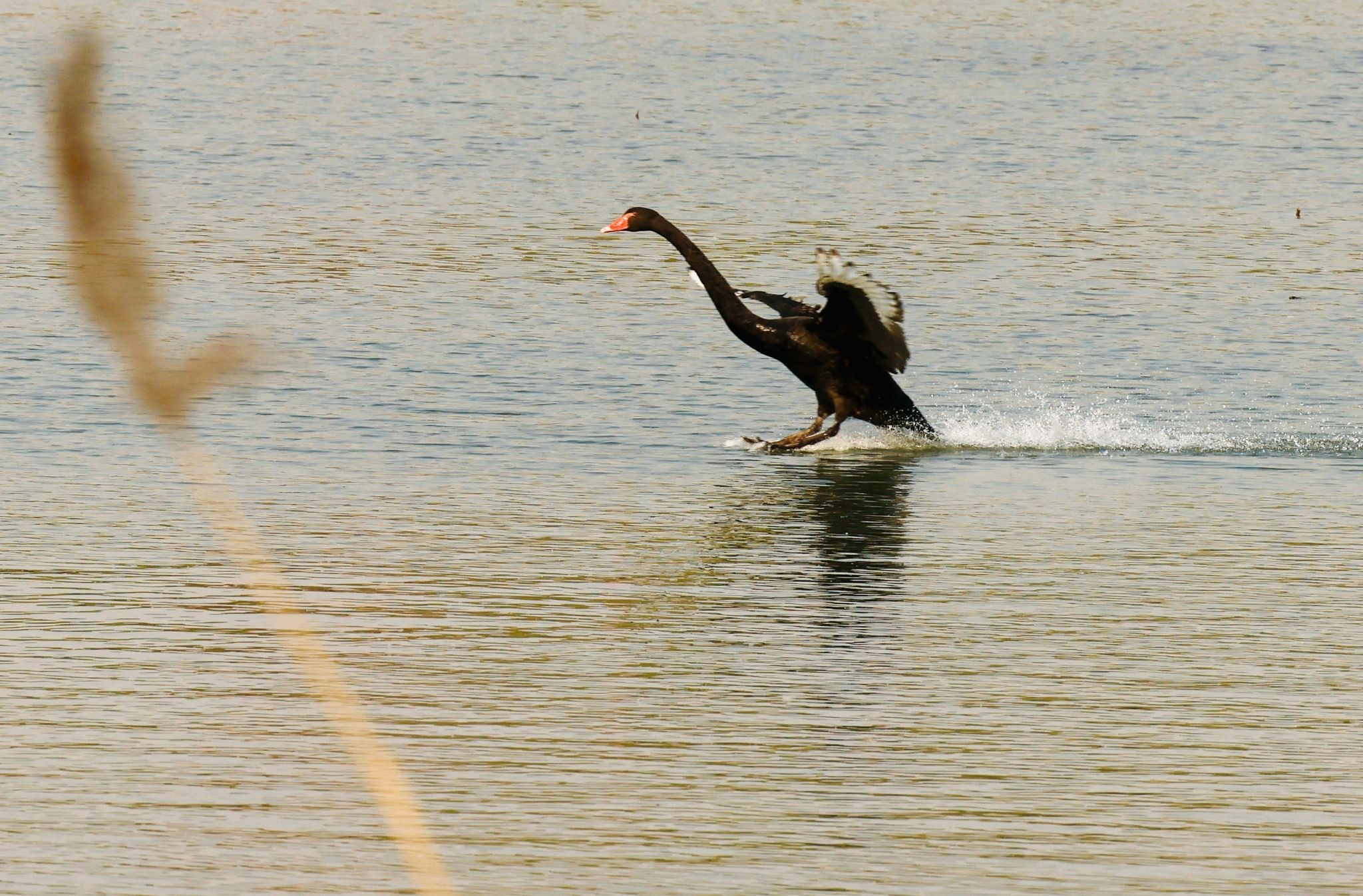 2025年4月6日,北京,玉渊潭公园吸引了大量市民游客前来玉渊潭公园观看“打鸟”景观。黑天鹅上演水上刹车。