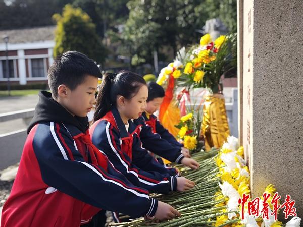 4月1日,“红领巾诞生地”江西萍乡安源黄静源烈士殉难处纪念碑前排起长队,宜春、新余、萍乡百余名少先队员来到这里,为烈士敬献鲜花。一同进行的还有一场授旗仪式:安源红领巾学校“黄静源中队”辅导员江华将象征薪火传承的“黄静源中队”旗帜,授予了三地新创建的5个少先队中队。