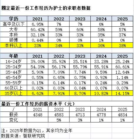 智联研究院向第一财经提供的数据也显示,近年来在护士求职市场上,“中年军”及本科以上学历者出现增加现象,而这或给刚刚毕业的专科生加大就业压力。根据智联研究院数据:近五年(2025年为第一季度数据),护士求职者中,35岁以上占比由2021年的6.62%逐年提升至2025年的14.15%,本科以上学历求职者占比由2021年的33%整体提升至2025年的38%。