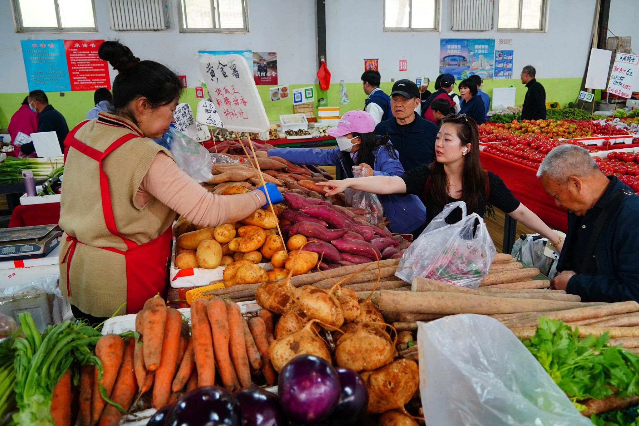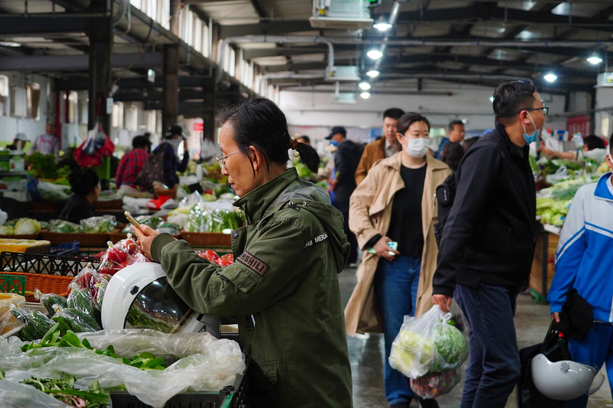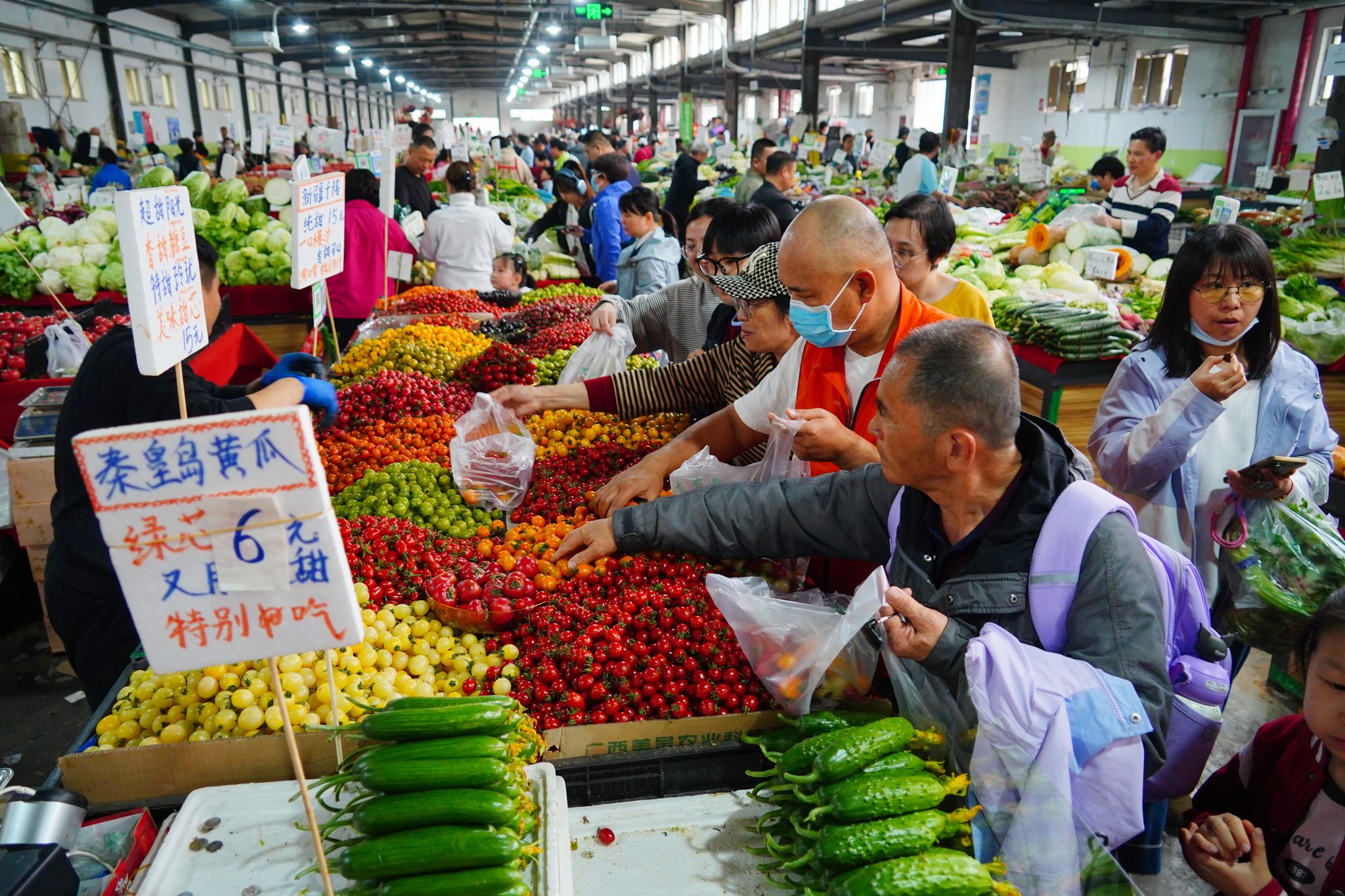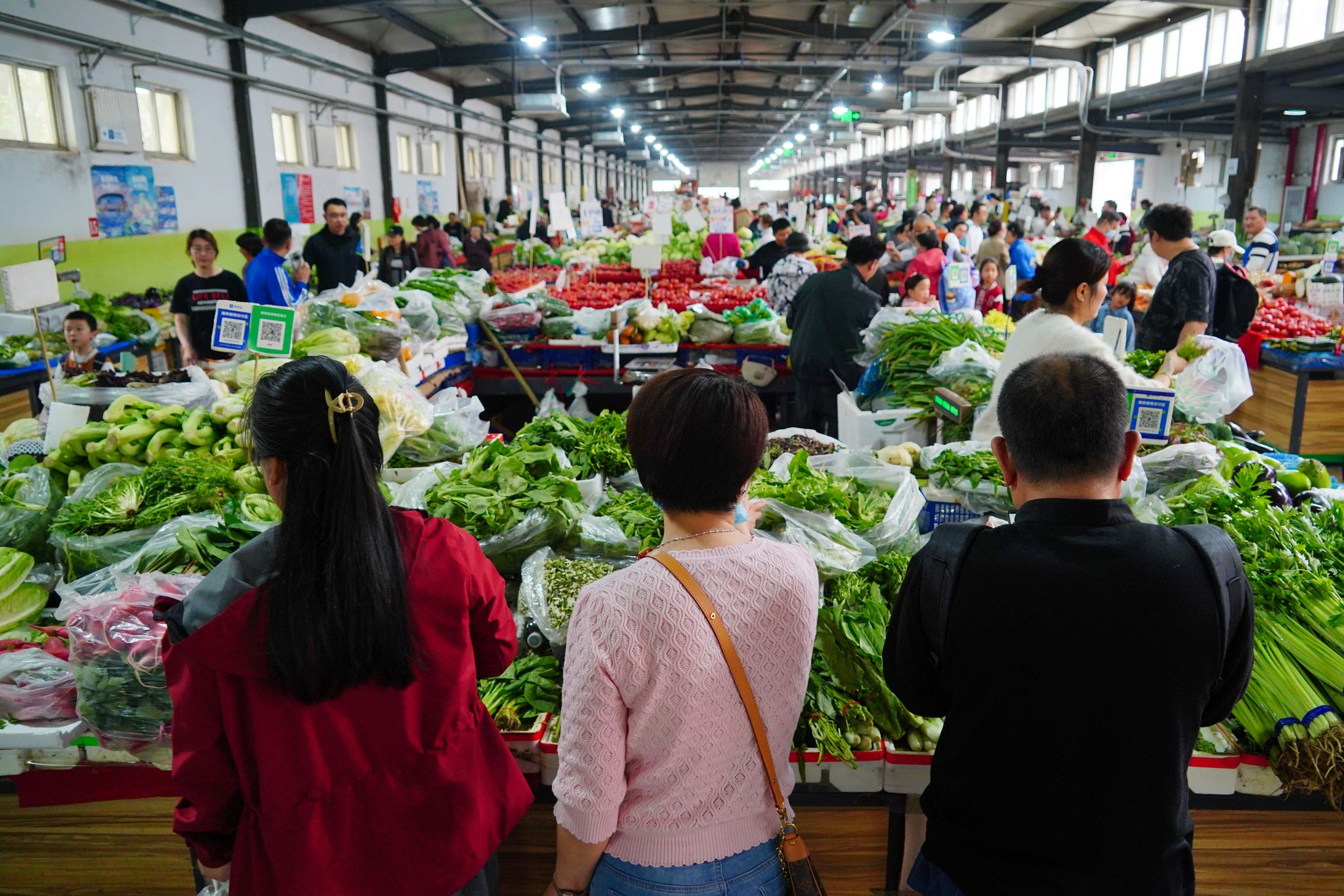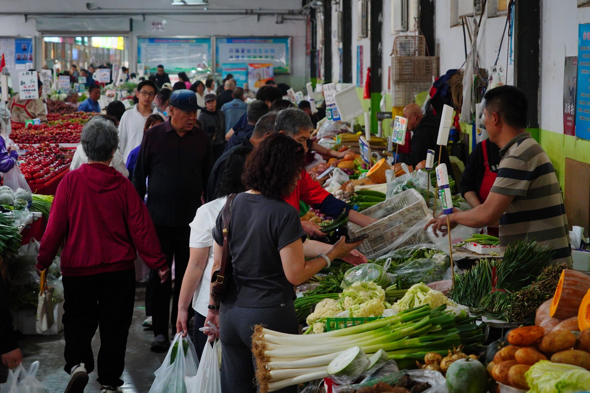2025年4月11日,北京,受大风影响,众多市民在羊坊店农贸市场购物,市场内蔬菜、水果等供应充足。
