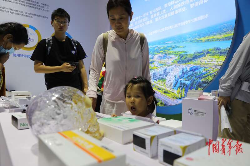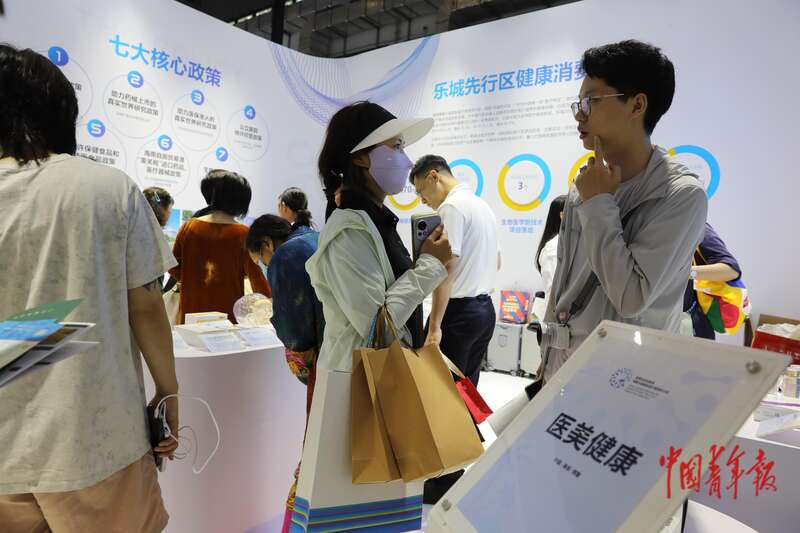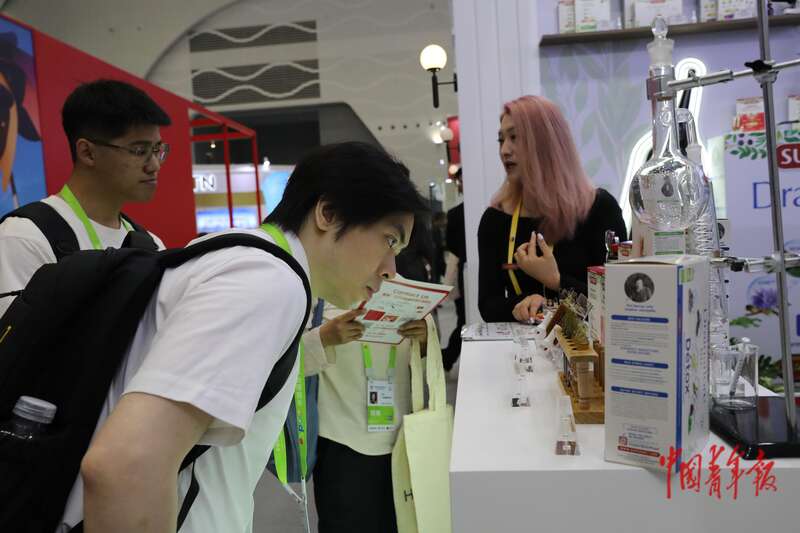 4月14日,海南海口,海南国际会议展览中心,第五届消博会,参观者在一家来自法国的保健品展位前驻足。中青报·中青网记者 孔斯琪/摄