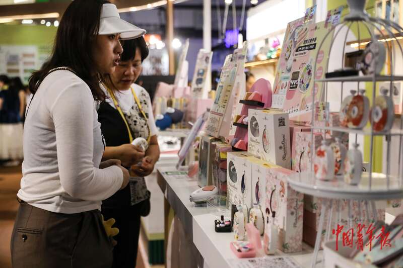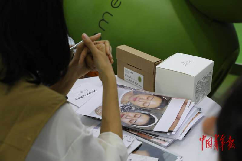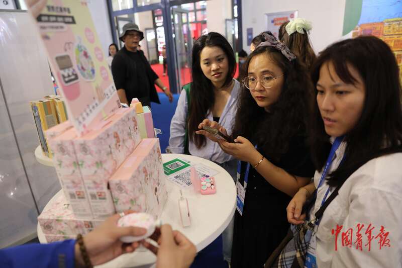 4月17日,海南海口,海南国际会议展览中心,第五届消博会,一名工作人员向一名想要尝试医美的女孩介绍一款用于微整形的注射剂。中青报·中青网记者 孔斯琪/摄