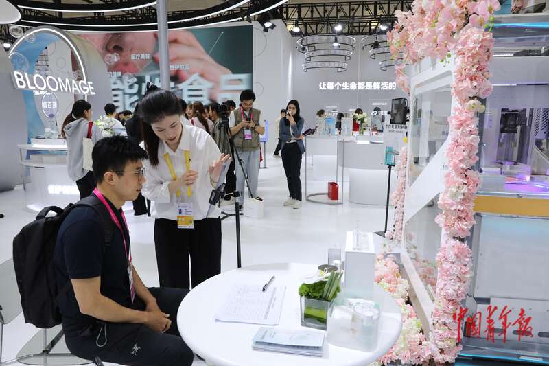 4月14日,海南海口,海南国际会议展览中心,第五届消博会,一名参观者在体验AI测肤和定制化护肤品设备。据工作人员介绍,这台设备采用微流控技术,最快可在8分钟内完成一瓶定制面霜的生产。中青报·中青网记者 孔斯琪/摄