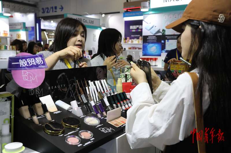 4月13日,海南海口,海南国际会议展览中心,第五届消博会,一名参观者在一家彩妆品牌展位试妆。中青报·中青网记者 孔斯琪/摄