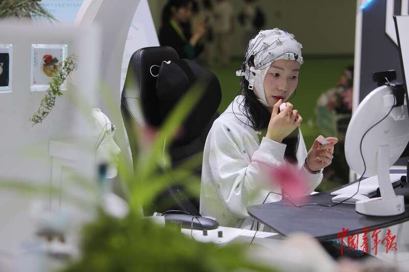 4月14日,海南海口,海南国际会议展览中心,第五届消博会一家国产美妆品牌的展位上,一名工作人员在演示该品牌与上海交通大学合作开发的多维全息AI感官行为研究系统。该系统通过对脑电波、眼动、微表情、肢体语言等多行为的实时监测,实现用户对产品的满意度研究。中青报·中青网记者 孔斯琪/摄