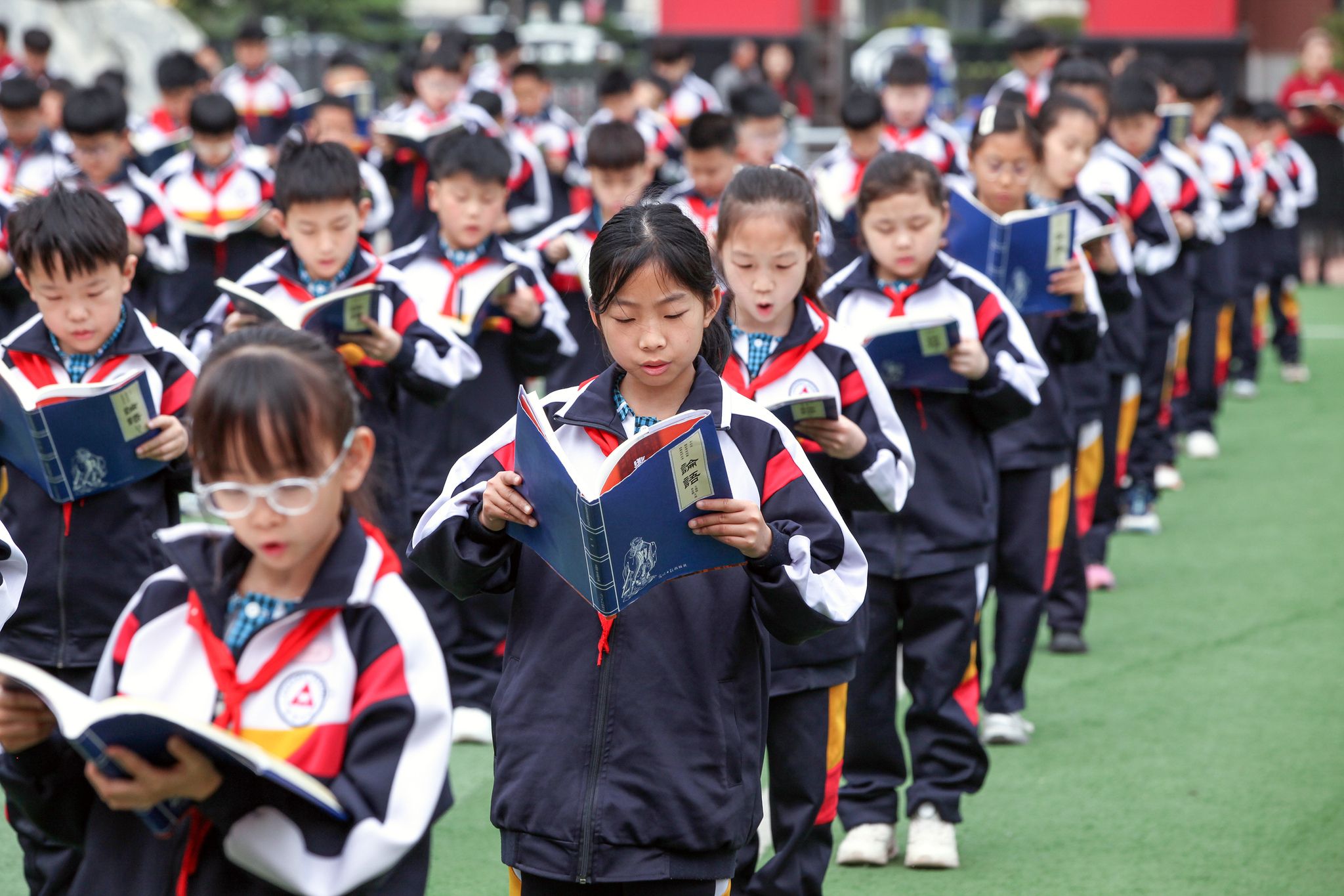 2025年4月21日,河南省焦作市博爱县永威学校,学生在诵读《论语》。
