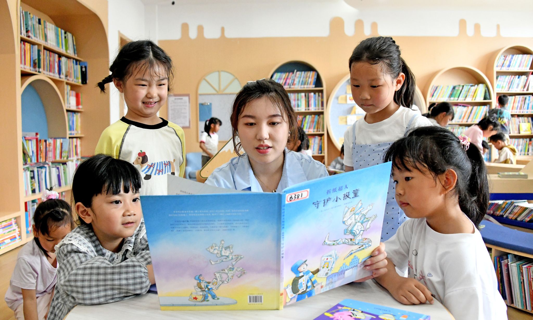 2025年4月22日,浙江省台州市仙居县迎晖幼儿园阅览室,老师陪伴孩子阅读。