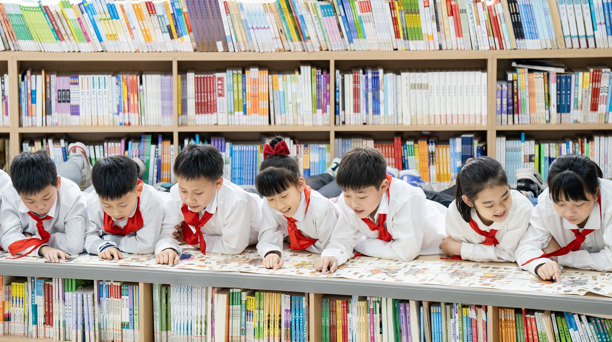 2025年4月21日,江苏南通,小学生在校园图书室内阅读图书。