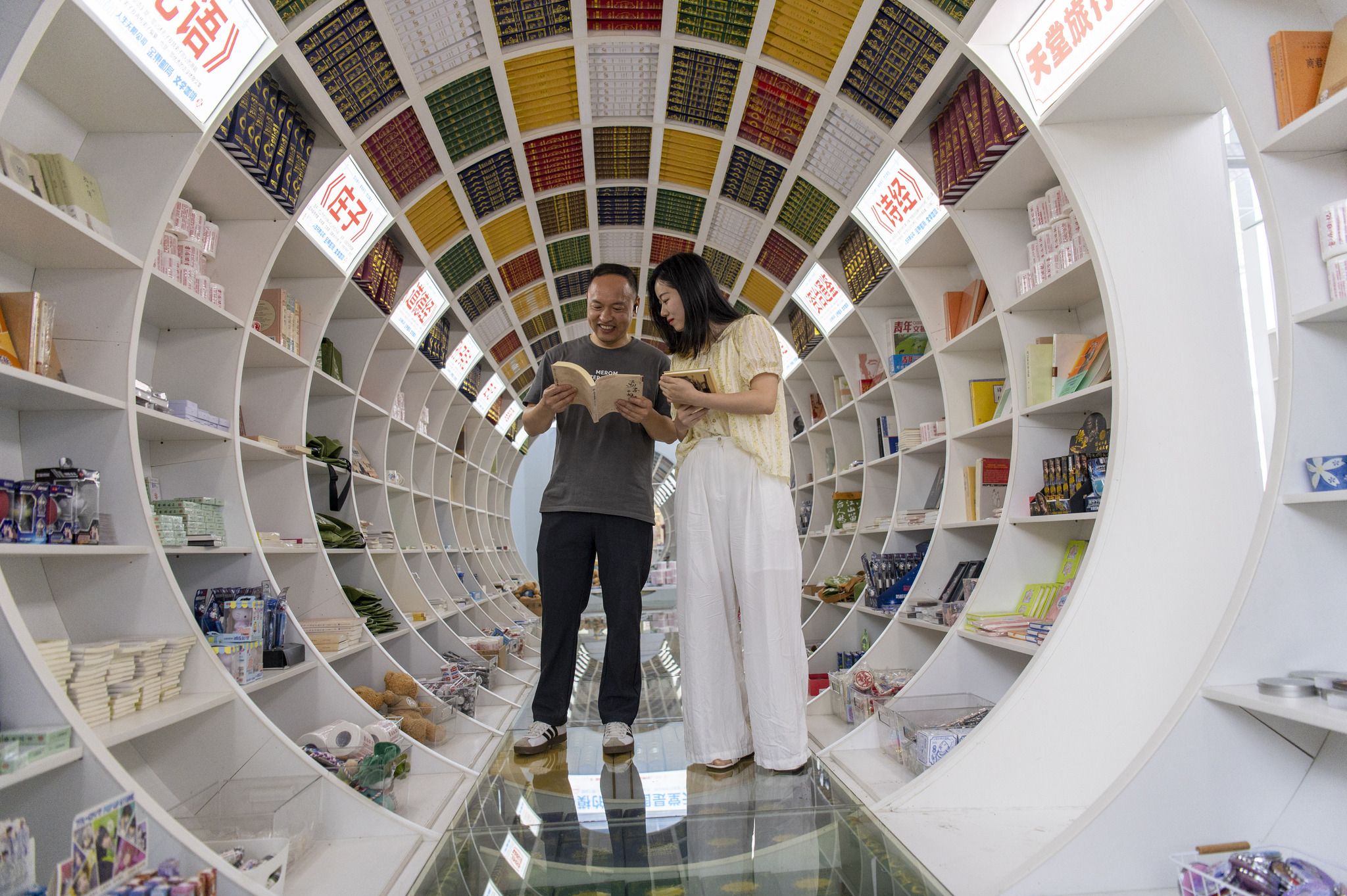 2025年4月21日,浙江省金华市金东区一家书店阅读长廊里,市民在阅读书籍中。
