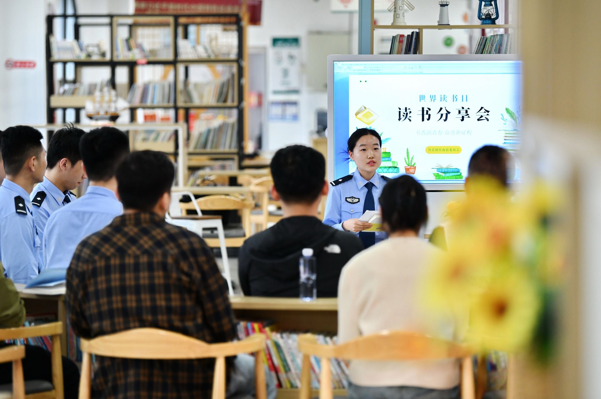 2024年4月21日,安徽阜阳,阜南县公安局民警在鹿城镇城西社区图书馆阅读书籍。在第30个“世界读书日”来临之际,阜南县团县委组织公安、检察等部门参加“书香润青春 奋进新征程”读书分享会。通过阅读,大家在书海中汲取智慧与力量,提升素养与能力。
