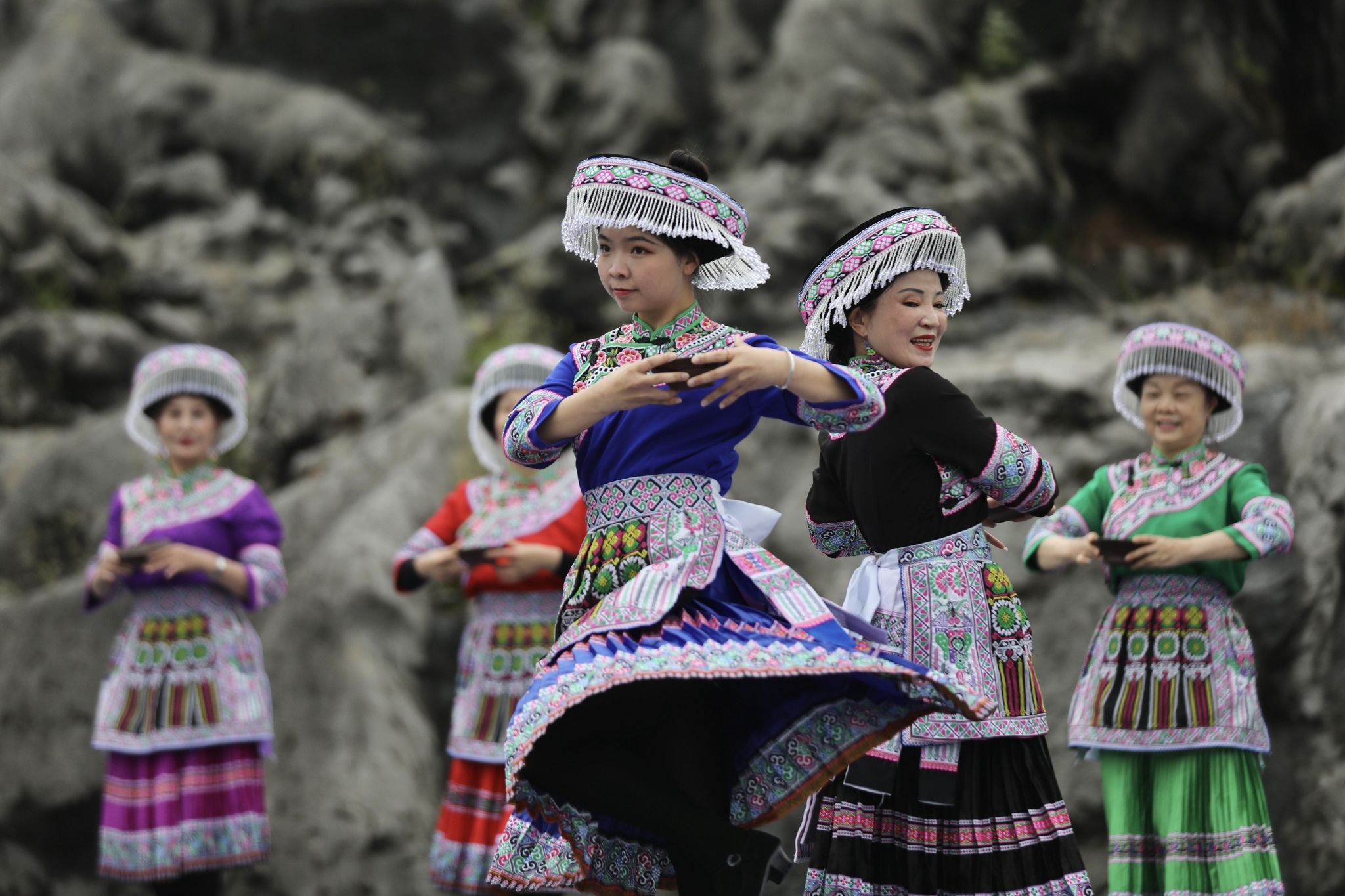 2025年4月26日,四川宜宾,兴文苗族花山节系列活动在兴文县石海景区举行,传统祭花杆祈福仪式、磨秋、石海巡游等活动,吸引苗乡儿女身着盛装,与八方宾客欢度这一盛大的苗族传统节日。图为苗族姑娘跳起敬酒舞。 中新社记者 王磊 摄