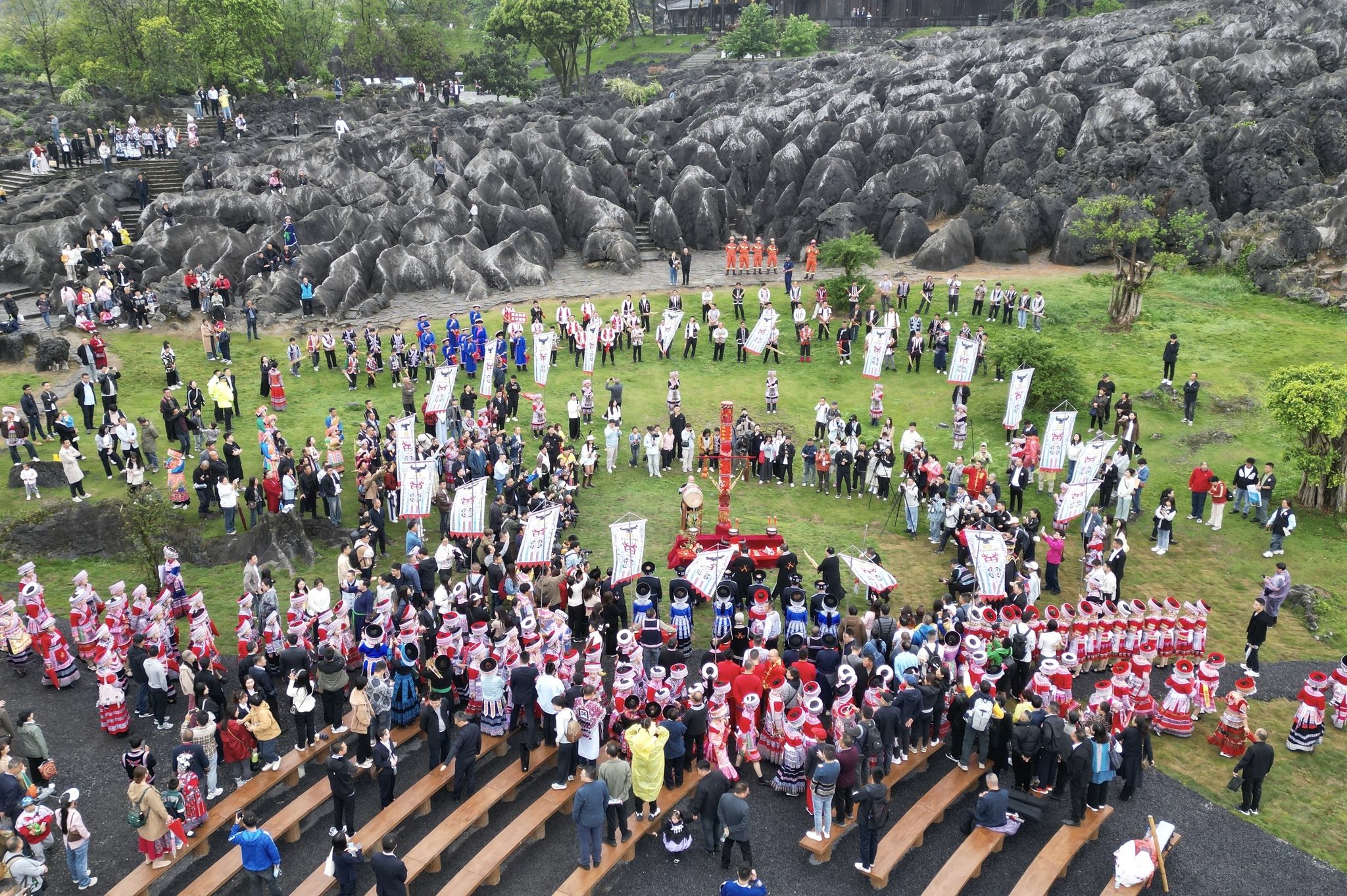 2025年4月26日,四川宜宾,兴文苗族花山节系列活动在兴文县石海景区举行,传统祭花杆祈福仪式、磨秋、石海巡游等活动,吸引苗乡儿女身着盛装,与八方宾客欢度这一盛大的苗族传统节日。图为传统祭花杆祈福仪式现场。(无人机照片) 中新社记者 王磊 摄