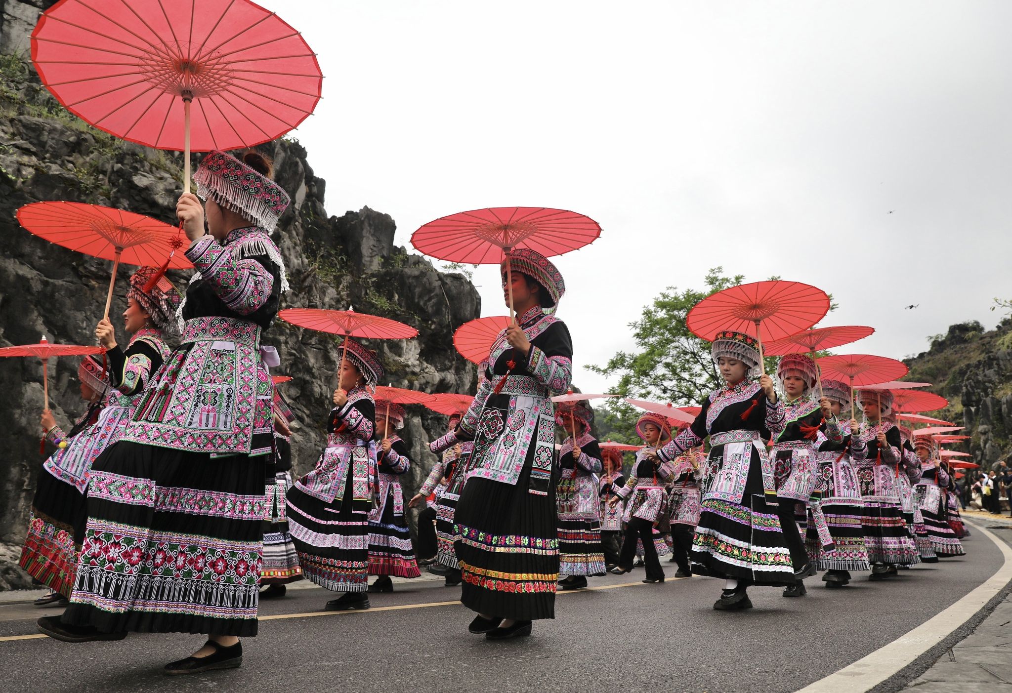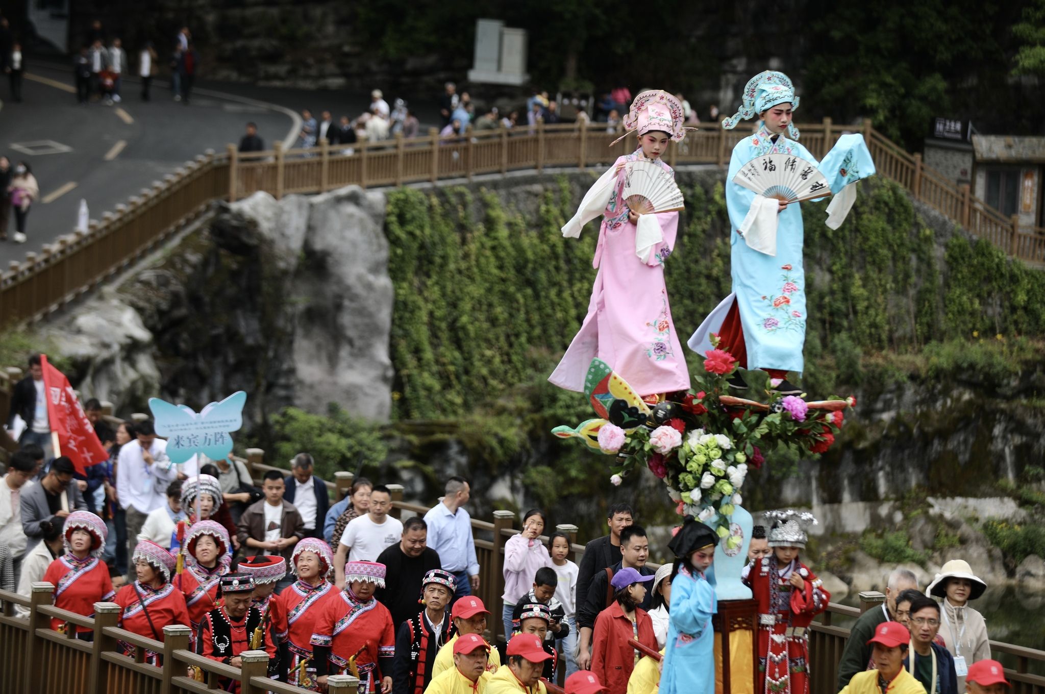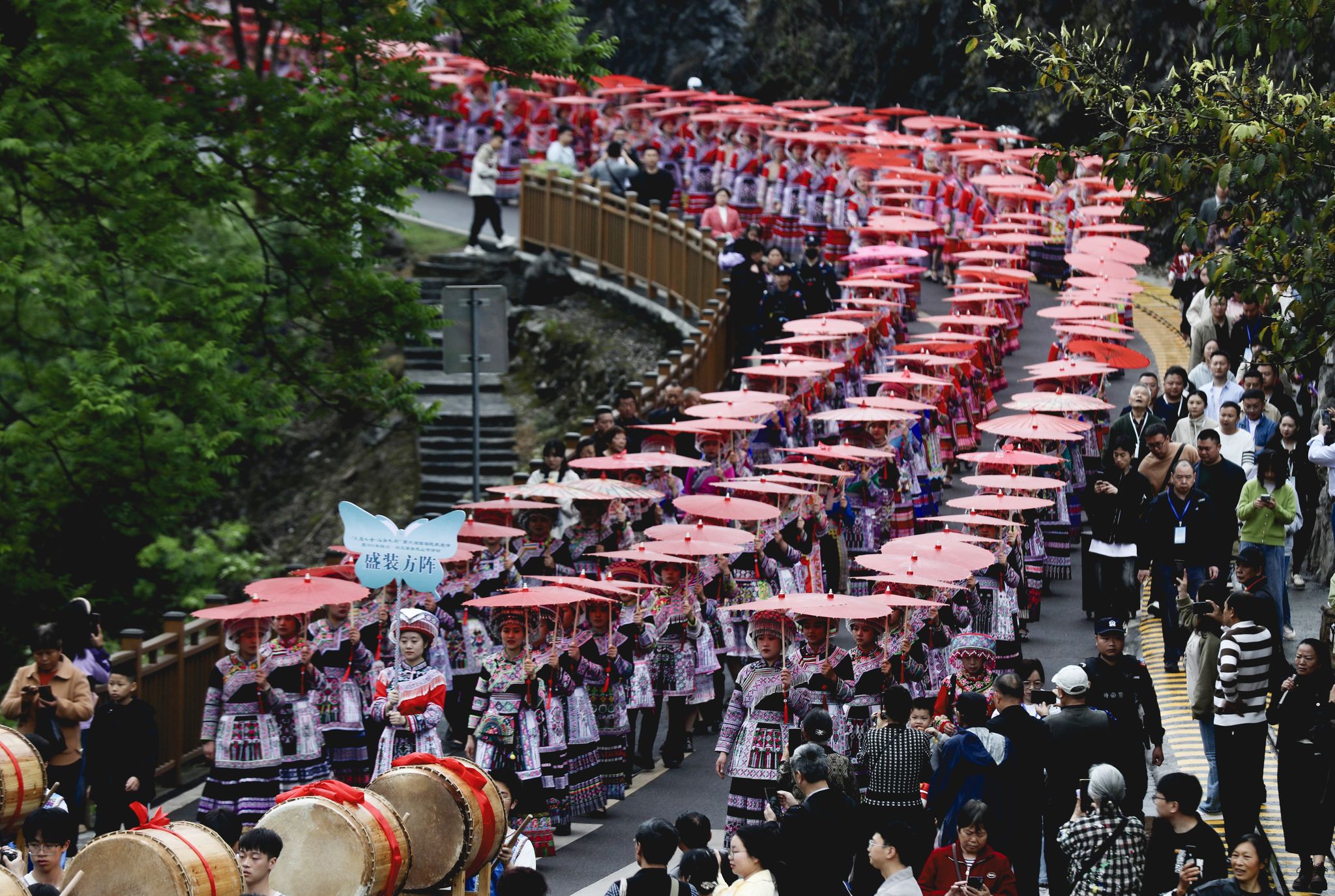 2025年4月26日,四川宜宾,兴文苗族花山节系列活动在兴文县石海景区举行,传统祭花杆祈福仪式、磨秋、石海巡游等活动,吸引苗乡儿女身着盛装,与八方宾客欢度这一盛大的苗族传统节日。图为在石海巡游的高装方队。 中新社记者 王磊 摄