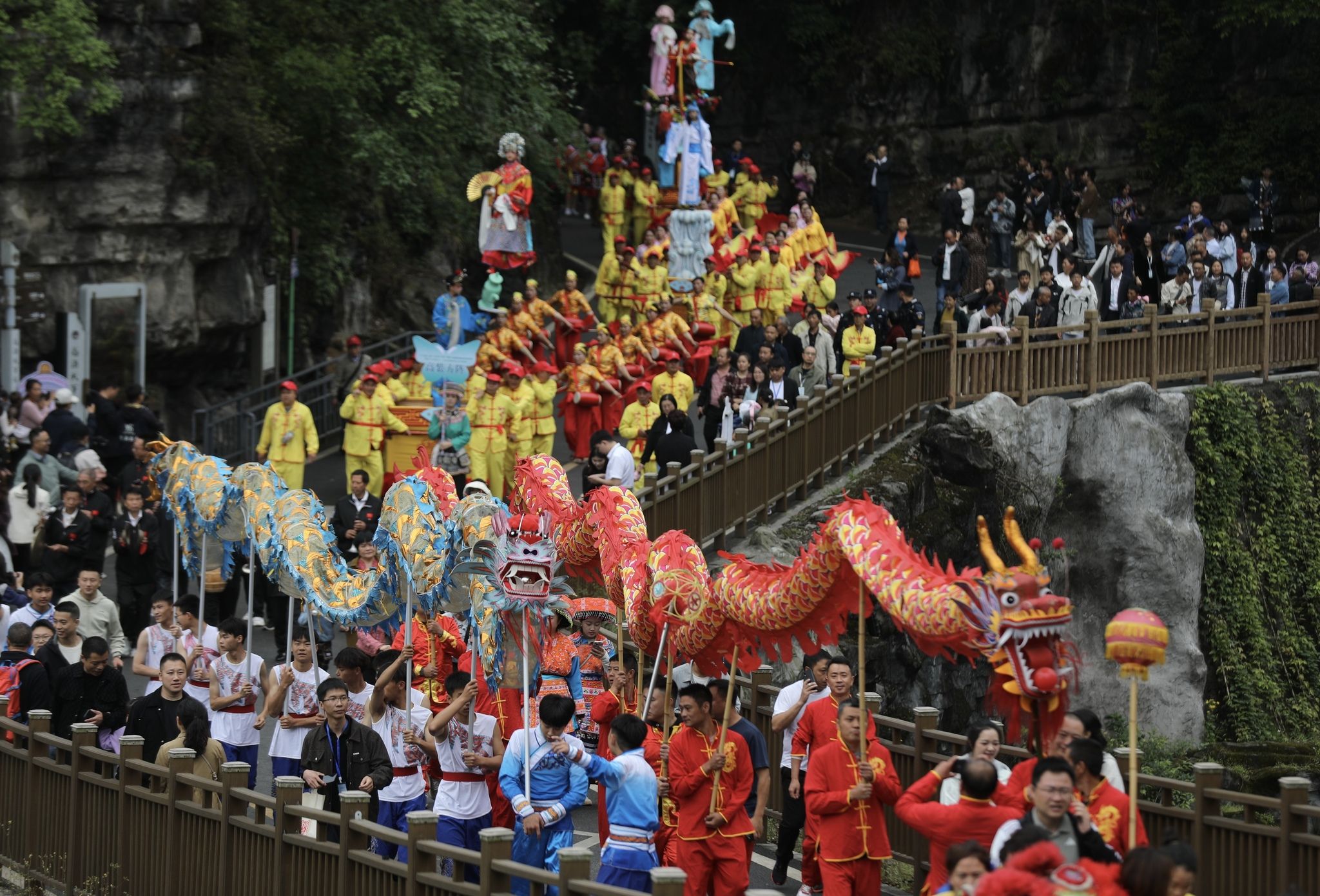 2025年4月26日,四川宜宾,兴文苗族花山节系列活动在兴文县石海景区举行,传统祭花杆祈福仪式、磨秋、石海巡游等活动,吸引苗乡儿女身着盛装,与八方宾客欢度这一盛大的苗族传统节日。图为在石海巡游的舞龙队。 中新社记者 王磊 摄