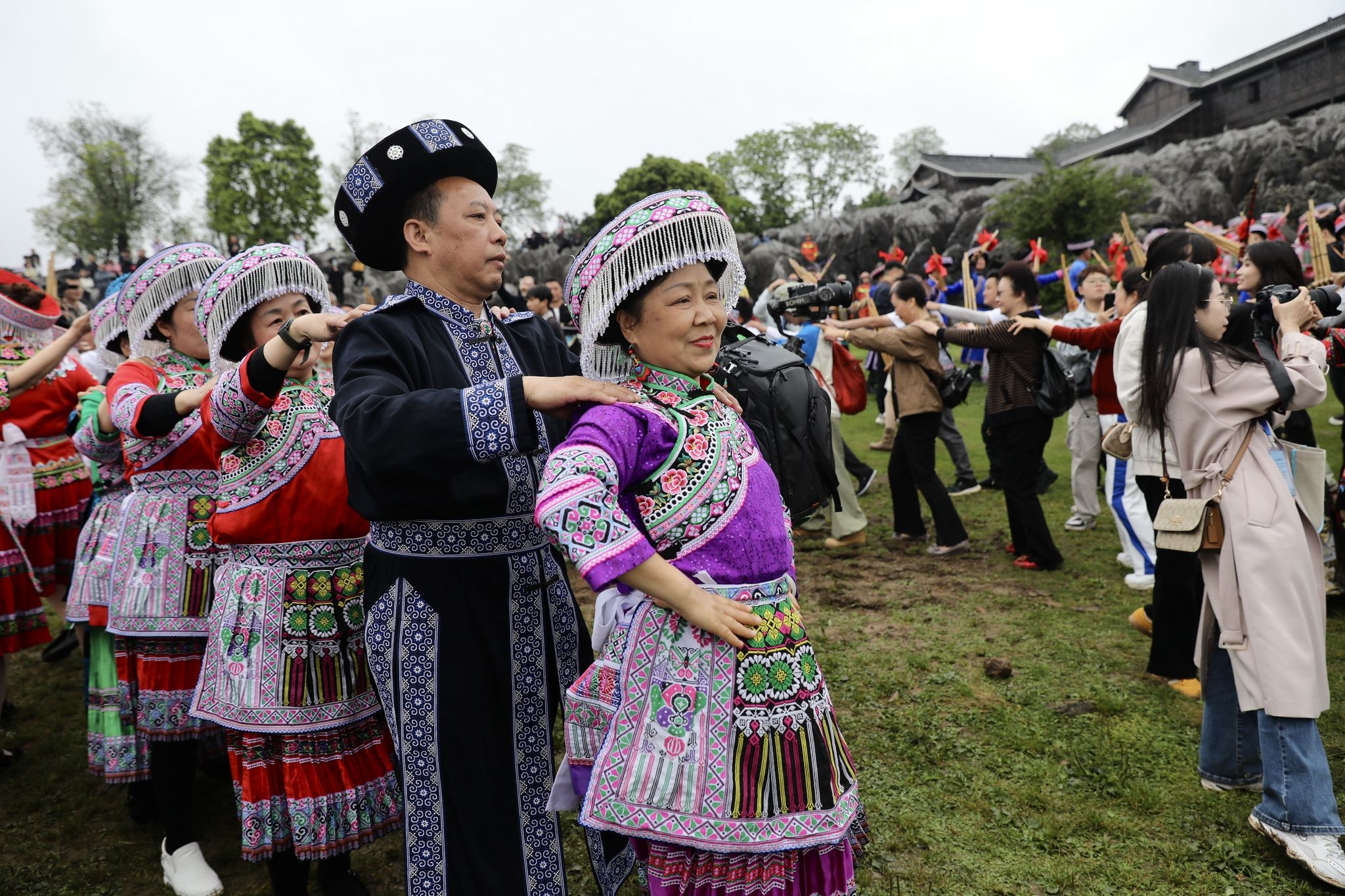 2025年4月26日,四川宜宾,兴文苗族花山节系列活动在兴文县石海景区举行,传统祭花杆祈福仪式、磨秋、石海巡游等活动,吸引苗乡儿女身着盛装,与八方宾客欢度这一盛大的苗族传统节日。图为苗族民众与游客一起跳舞。 中新社记者 王磊 摄