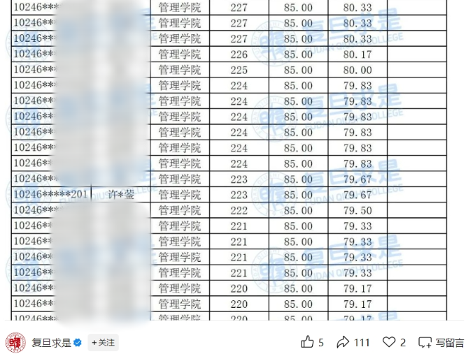 4月24日,“复旦求是”微信公众号发布2025年入学复旦管理学院MBA、EMBA、MPAcc项目拟录取考情分析,有网友发现,其中就有网红博主“迅猛龙 特蕾莎”许锴蓥。