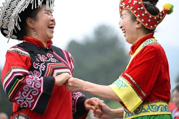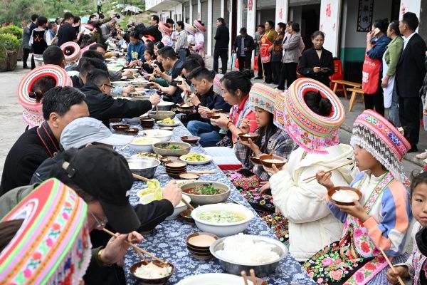 2025年4月26日,重庆市綦江区石壕镇石泉村举办"和睦邻里 和美石泉"邻里节活动。当地村民与游客齐聚一堂,共同体验苗族特色长桌宴、竹竿舞等民俗活动,并观赏民族文化文艺表演。活动不仅通过特色饮食和互动游戏增进了邻里交流,更以独特的苗族文化魅力吸引游客参与,为和美乡村建设注入新活力。