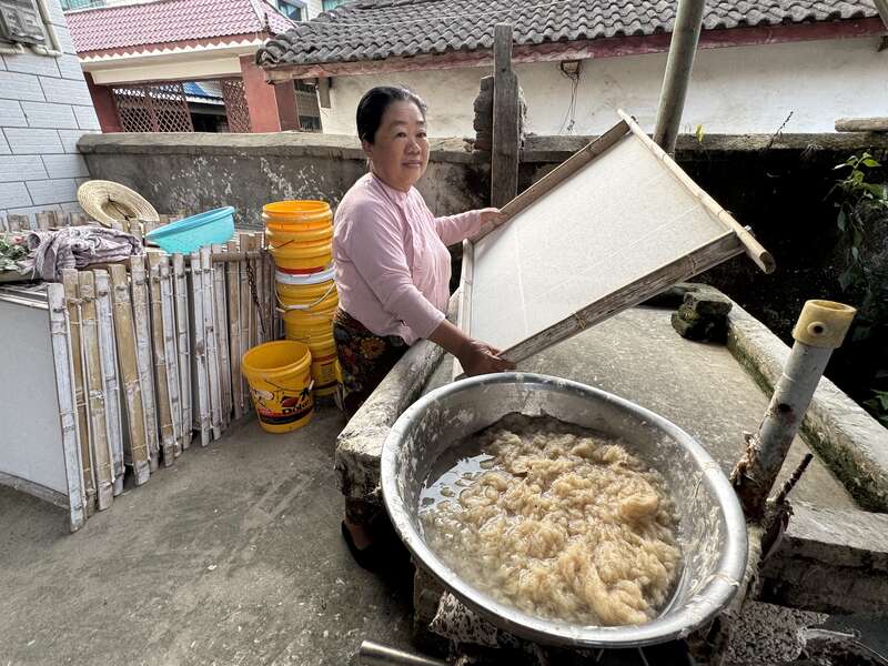 与南汀画院相距不远的芒团村,以盛产手工白棉纸而闻名。2006年,青年艾叶选择回村造纸,在传统白棉纸的技艺上,她又研发了有新鲜花朵、树叶的新式白棉纸,深受游客、茶商喜爱。此后,她成立公司,村里的造纸户们积极加入,开发出20多款文创产品,远销缅甸、泰国等东南亚国家。2024年,芒团白棉纸产量390万张,产值780万余元,带动120多人就地就业,人均增收3万余元。
