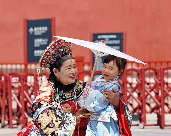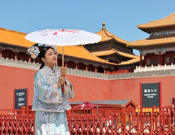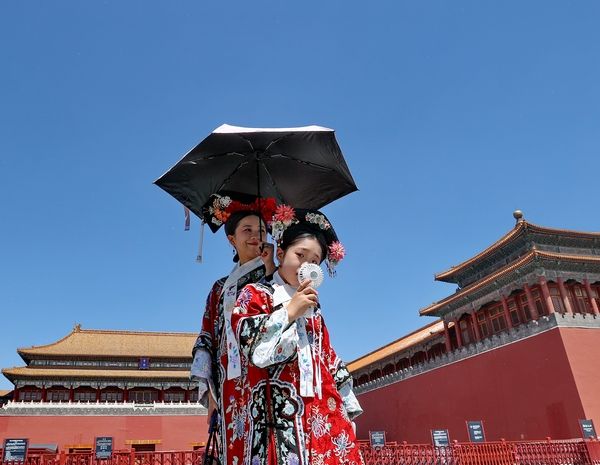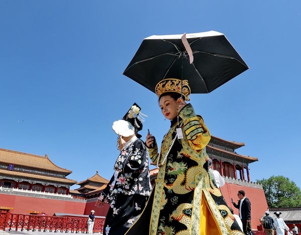 2025年4月28日,北京,游客穿古装游览故宫午门,并采取打太阳伞、戴遮阳帽、穿防晒服等方式遮阳防晒。当日北京开启晴晒模式,紫外线照射强烈,宛如夏日一般。