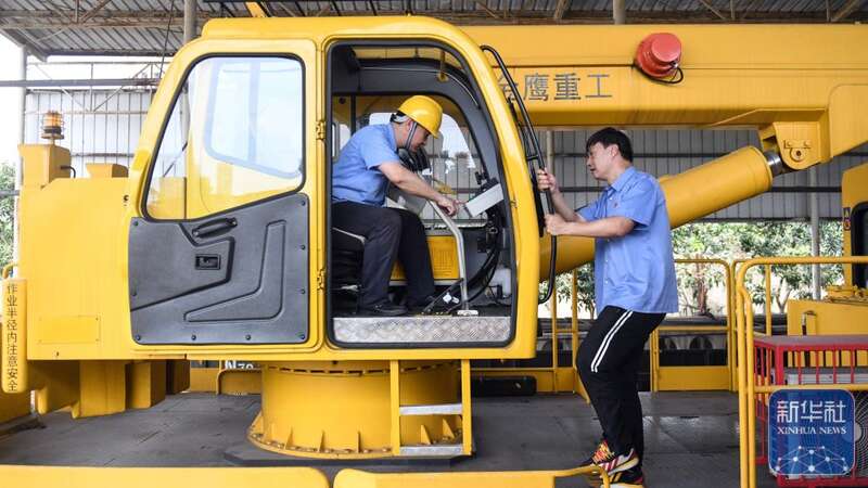 彭春林(左)在柳州动力设备车间检查接触网作业车防倾覆装置使用情况(4月25日摄)。