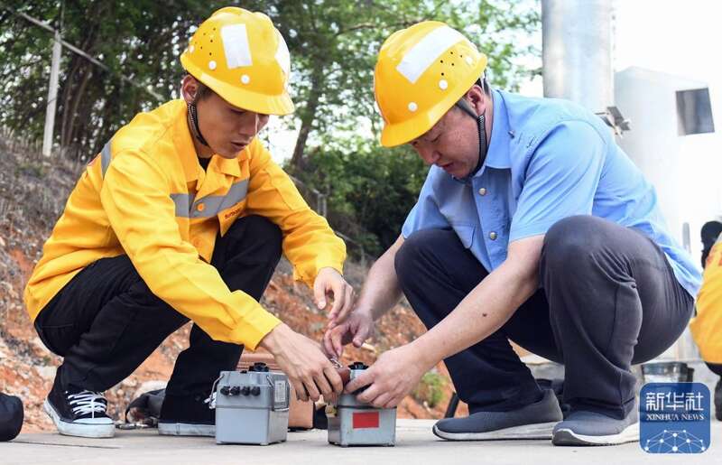 彭春林(右)在国铁南宁局职工培训基地指导青年职工使用电极型接地仪测试卡(4月25日摄)。