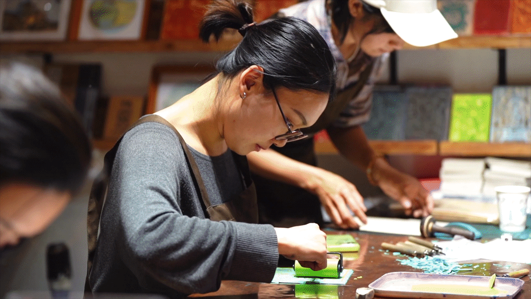 一名游客(左)在云南省大理州沙溪镇寺登村体验制作甲马版画(4月18日摄)。新华社记者胡超 摄