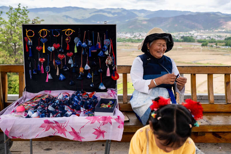 云南省大理州沙溪镇华龙村的白族老人何先会在整理制作好的手工刺绣香囊(4月20日摄)。新华社记者 刘莲芬 摄