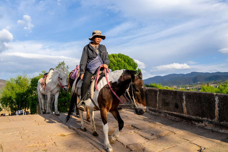 村民骑马经过云南省大理州沙溪镇寺登村玉津桥(4月18日摄)。新华社记者刘莲芬 摄