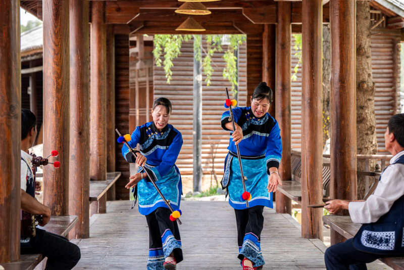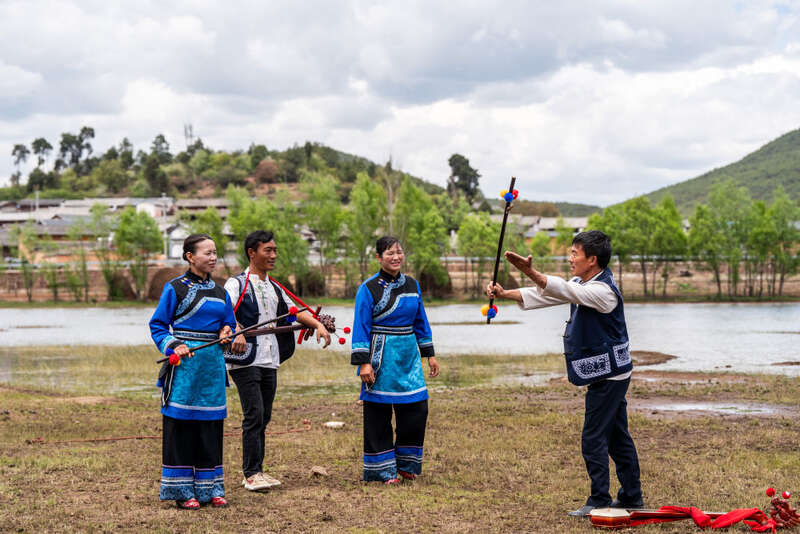 在云南省大理州沙溪镇石龙村,石宝山歌会国家级非遗传承人姜伍发(右二)和徒弟在排练节目(4月19日摄)。新华社记者胡超 摄