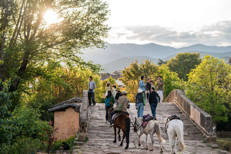 云南省大理州沙溪镇寺登村村民与游客通过玉津桥(4月18日摄)。新华社记者胡超 摄