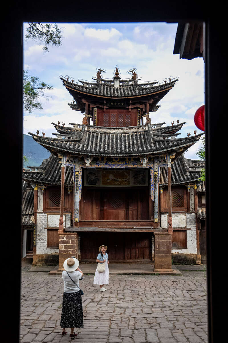 游客在云南省大理州沙溪镇寺登村古戏台前拍照留念(4月18日摄)。新华社记者胡超 摄