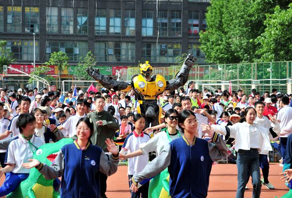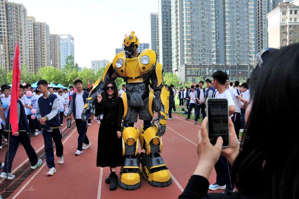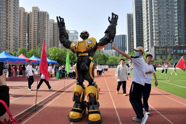 2025年4月30日,郑州市96中学的春季运动会,一人多高的机器人“大黄蜂”成了学生和家长中的大明星,人们纷纷前来合影,给运动会增添了科技乐趣。