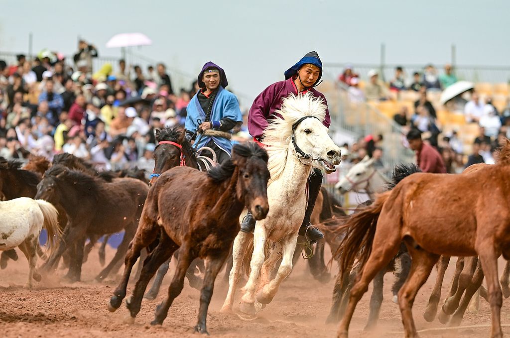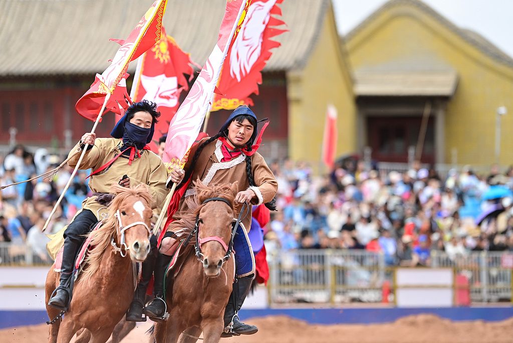 2025年5月1日,内蒙古鄂尔多斯,伊金霍洛旗鄂尔多斯文化产业园景区沉浸式剧场,演员表演实景剧《战马传奇》。