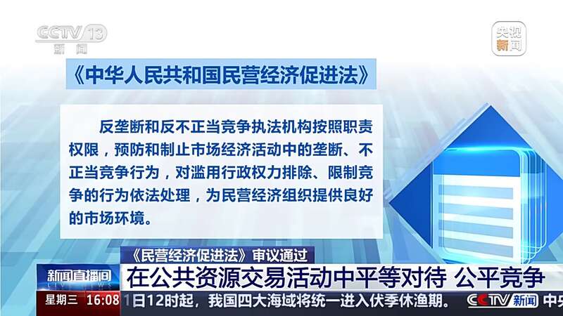 据杨合庆介绍,民营经济促进法在保障公平竞争方面,完善了民营经济组织市场准入领域公平参与市场竞争的制度机制,把实践中行之有效的政策和做法确定为法律制度。