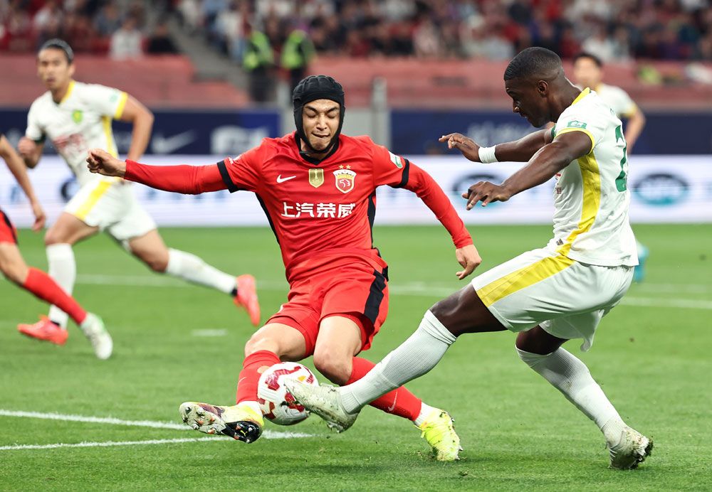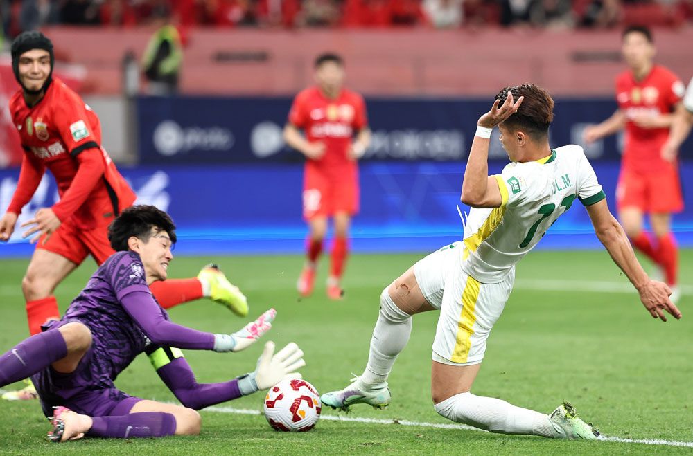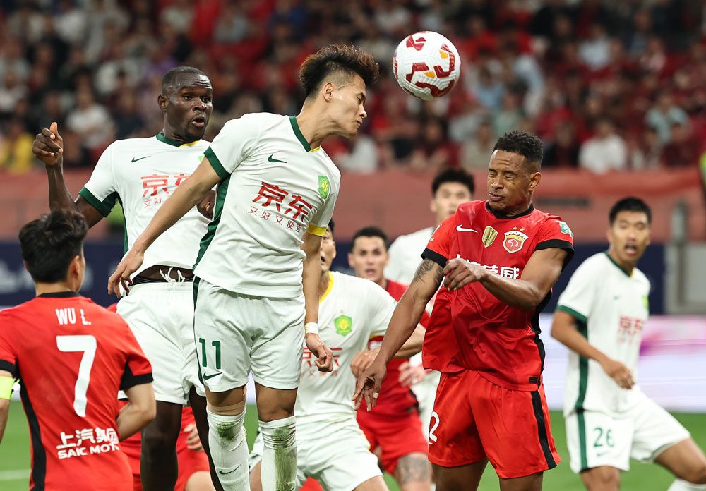 上海海港队5号张琳芃(左四)头球攻门被国安队守门员侯森扑出。刘占崑/摄