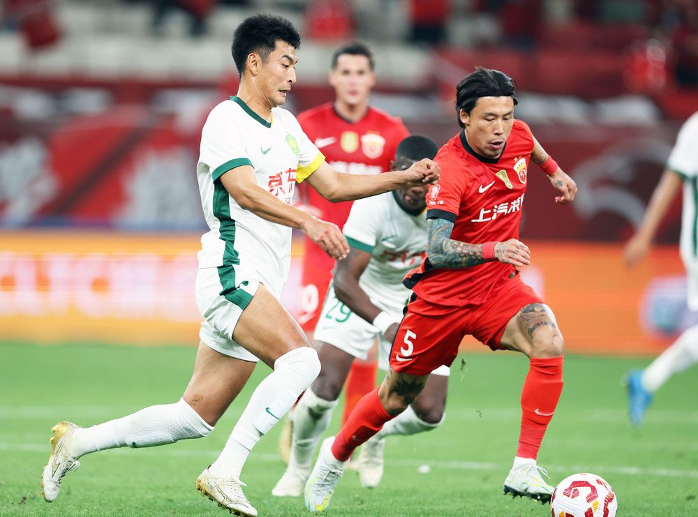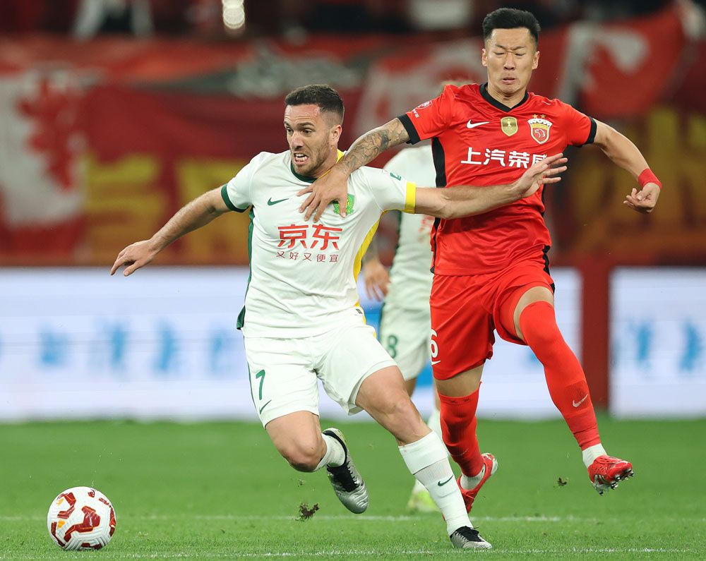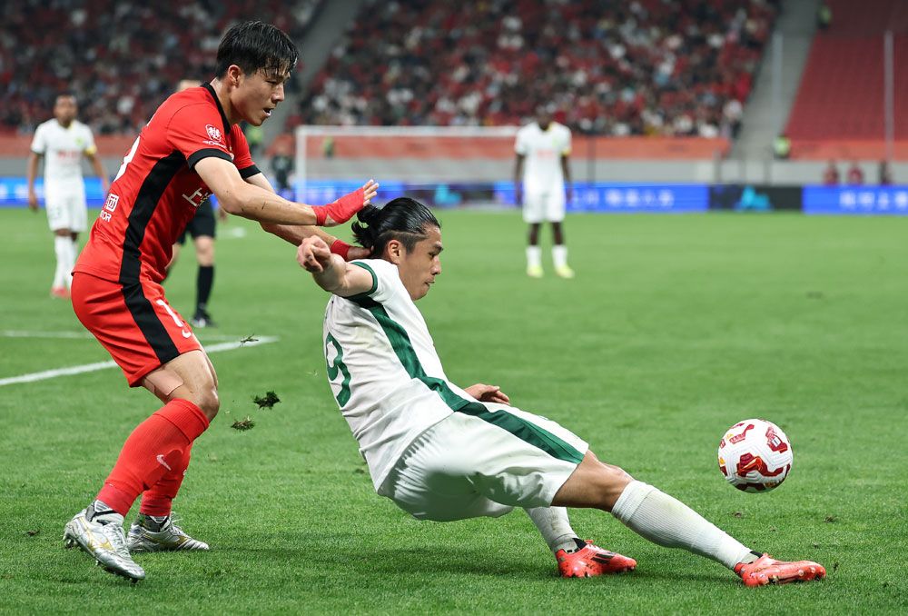 北京国安队7号塞尔吉尼奥(左)与海港队6号徐新争夺。刘占崑/摄