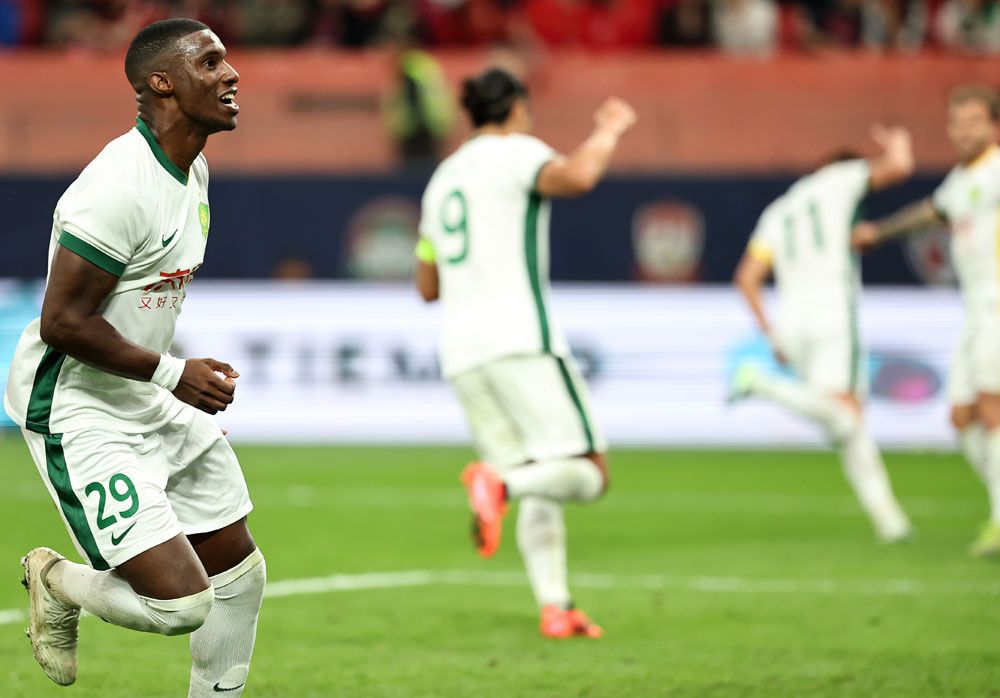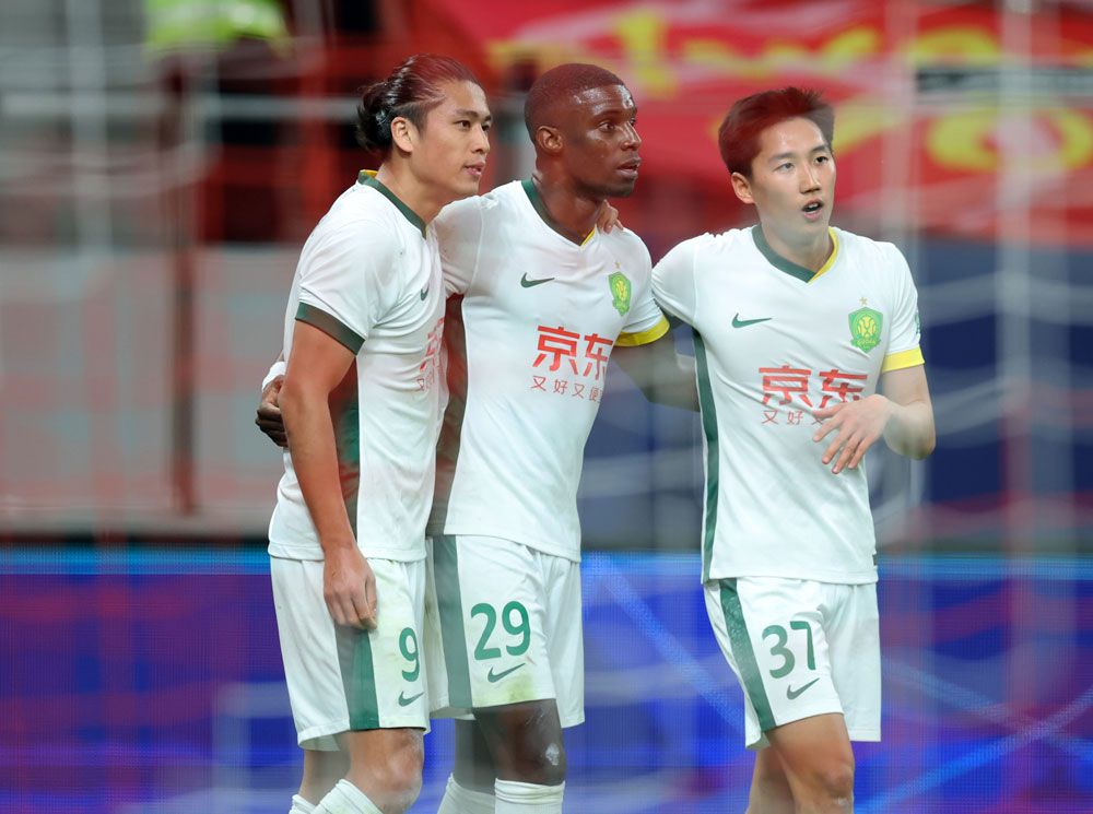 北京国安队29号法比奥(左)庆祝反超比分。刘占崑/摄