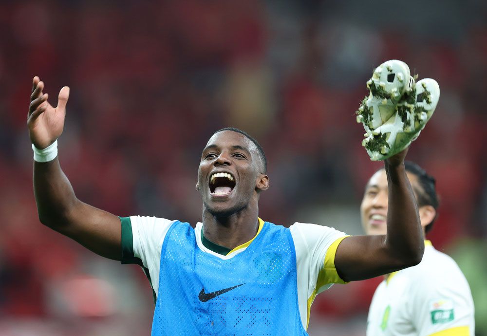 北京国安队29号外援法比奥挥舞战靴庆祝胜利。刘占崑/摄