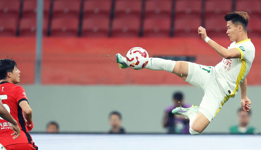 北京国安队11号林良铭空中停球。刘占崑/摄