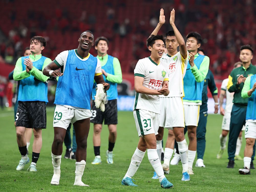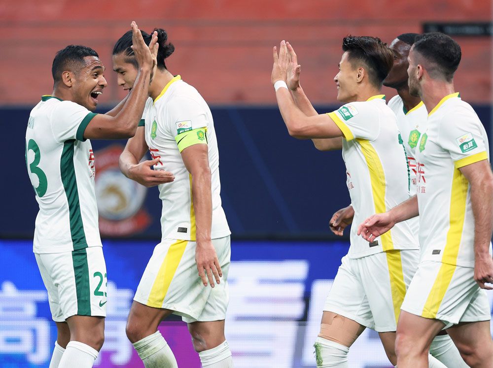 北京国安队队员庆祝第二个进球。刘占崑/摄