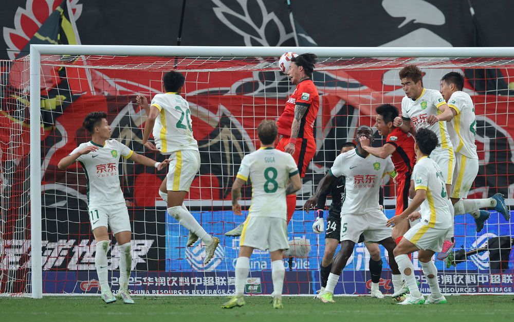 北京国安队11号林良铭(左三)头球功门。刘占崑/摄