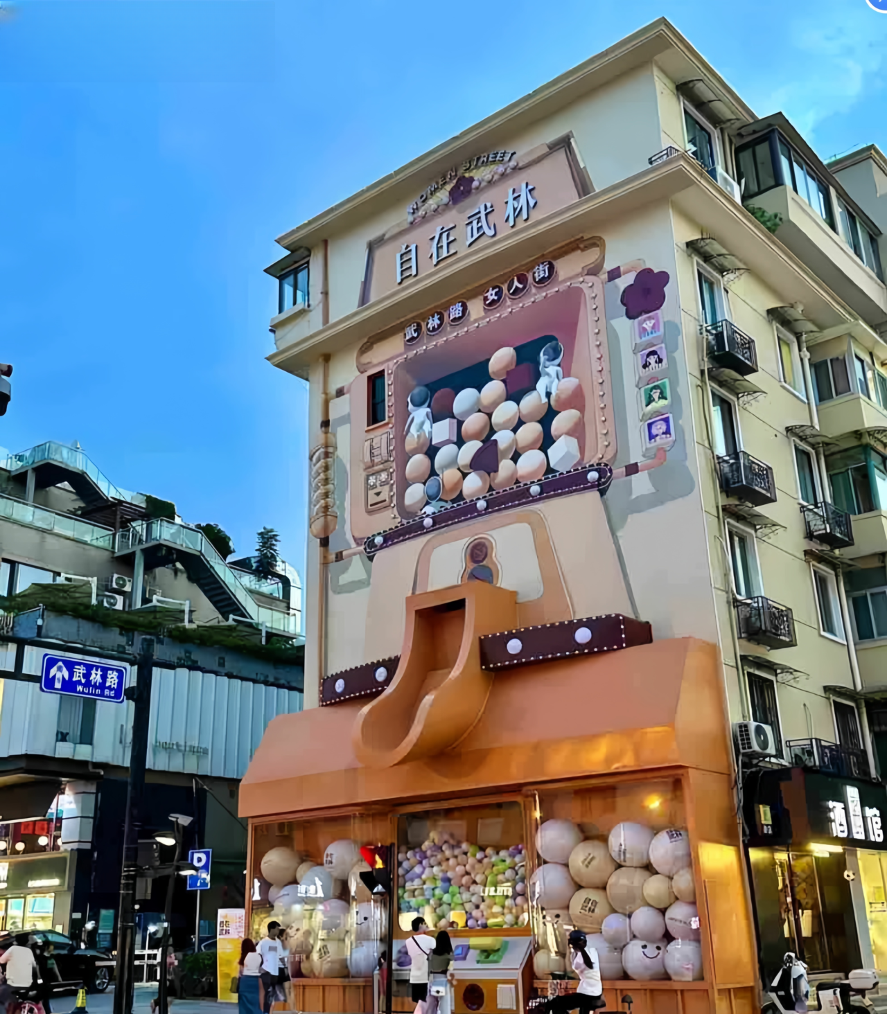 倪佳喜说,7米多高、占据整栋居民楼侧楼的巨型扭蛋机,当时给杭州武林路带来了很大的人流量。