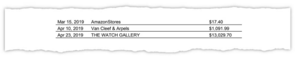 对账单显示,在伦敦的手表画廊(Watch Gallery)消费了13,029.70美元,在Hugo Boss购买羊毛西装及其他衣物消费了10,000美元,在奥地利的爱马仕店花费了2,045.31美元,在瑞士的梵克雅宝(Van Cleef & Arpels)珠宝店花费了1091.99美元。