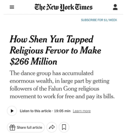 2024年12月29日,美国《纽约时报》发表深度报道《“神韵”如何利用信徒狂赚2.66亿》一文,报道以梁先生母亲为例,指出“神韵”积累的巨额财富,绝大部分来自于“法轮功”信徒的免费工作及账单支付。梁母的故事令人悲恸:她和丈夫卖掉房子,将卖房款悉数捐给了“法轮功”;不但自己替“法轮功”无偿服务,还将子女送到“山上”参加“神韵”表演。梁母虽然为李洪志及其“法轮功”百般卖命,但并未获得自己想要的,反而罹患肾癌,医疗费用高达数万美元。就在梁母因钱财尽数给了“法轮功”而无力承担这笔救治费用只能忍受疾病痛苦时,李洪志和他的妻子却用梁母的账户购买了数万美元奢侈品。2019年10月,被病痛折磨至仅31.75公斤的梁母撒手人寰。