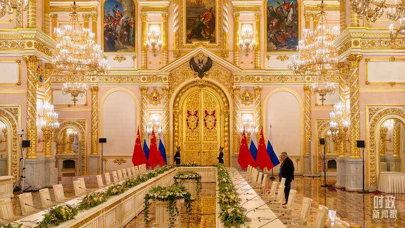 8日上午,在克里姆林宫二层的乔治大厅,普京总统为习主席举行隆重欢迎仪式。两国元首从两侧沿红地毯健步走入大厅中央,亲切握手合影。2019年、2023年习主席对俄罗斯进行国事访问时,普京总统也是在这里为习主席举行隆重欢迎仪式。