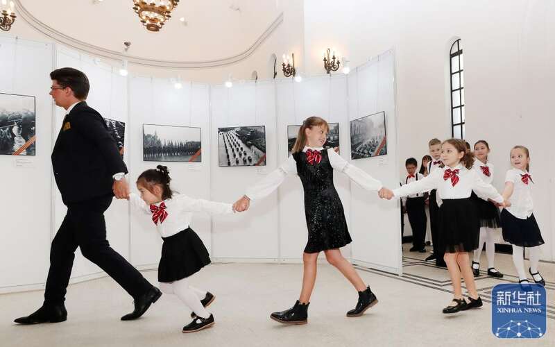 2020年8月30日,俄罗斯联邦驻上海总领事馆主办的《纪念伟大卫国战争暨中国人民抗日战争胜利75周年》图片展在上海举行。由俄通社—塔斯社、俄罗斯国际通讯社和俄罗斯联邦档案署提供的80余幅拍摄于1941年至1945年卫国战争时期的图片在展览上展出。这是中俄小朋友手拉手走进图片展现场。