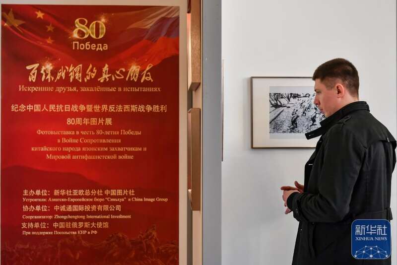 2025年4月18日,“百炼成钢的真心朋友”——纪念中国人民抗日战争暨世界反法西斯战争胜利80周年图片展在中国驻俄罗斯大使馆举行。这是嘉宾参观图片展。