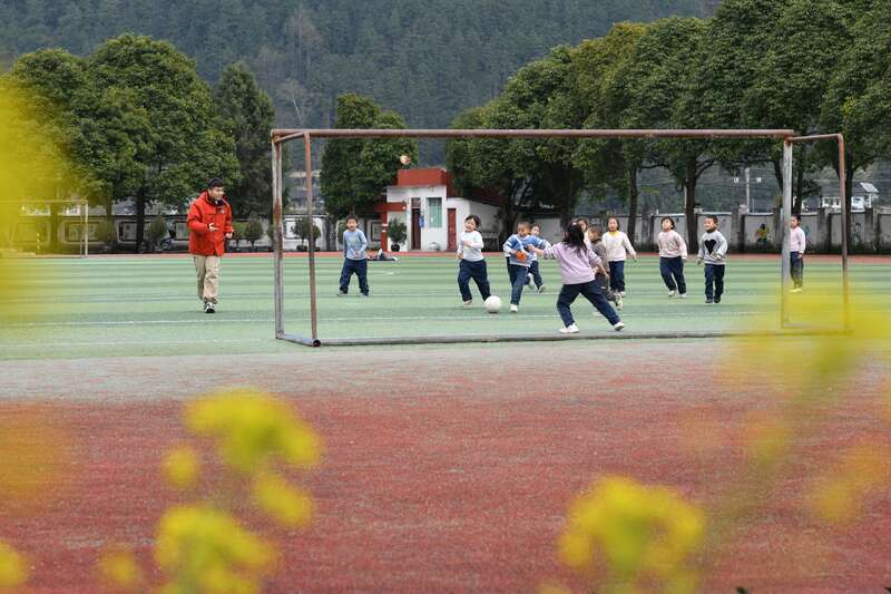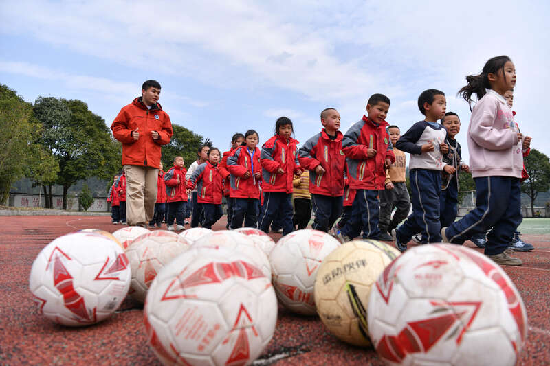 3月20日,贵州省黄平县上塘镇中心小学,徐州医科大学研究生支教团成员郭喜亮与学生一起踢足球。梁文/摄