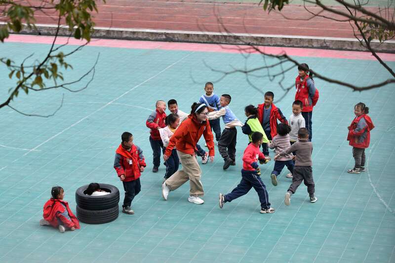 3月20日,贵州省黄平县上塘镇中心小学,徐州医科大学研究生支教团成员唐佳丽与学生一起做游戏。梁文/摄
