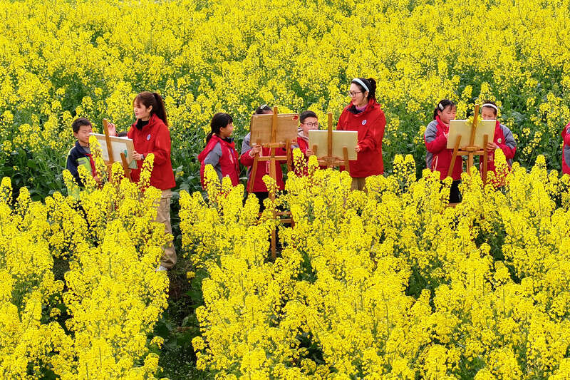 3月20日,贵州省黄平县,徐州医科大学研究生支教团成员陈鑫(左)唐佳丽(右)与贵州省黄平县上塘镇中心小学学生在学校门口油菜花田间绘画。梁文/摄
